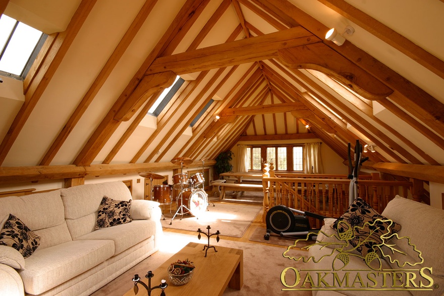 However, if your clients don’t have the space inside their home, why not create a loft space in their oak framed garage or outbuilding? Or build an oak framed garage with extra loft space included? Oak framed loft rooms can transform a humble garage and add an extra working, living or playing area.