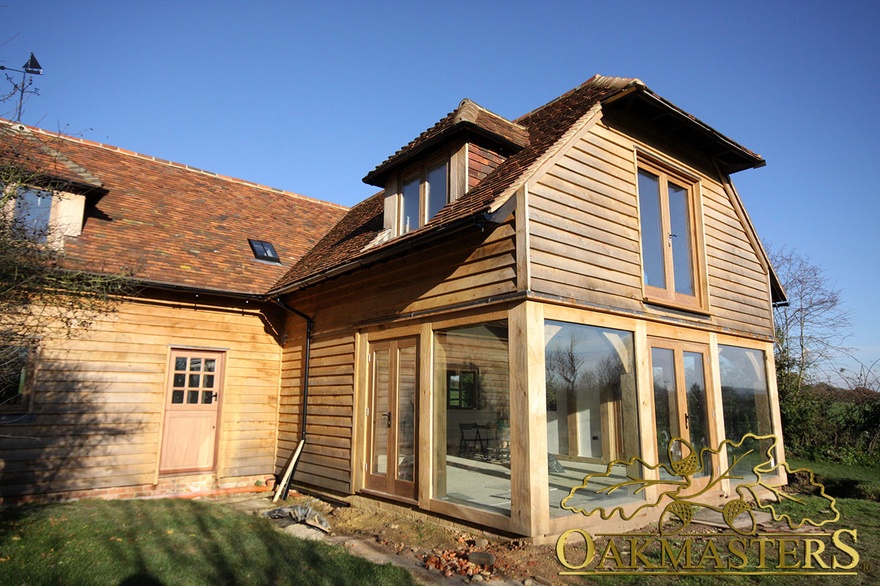 Oak framed garage as part of an L shaped oak clad house (4956) Enquire about this image