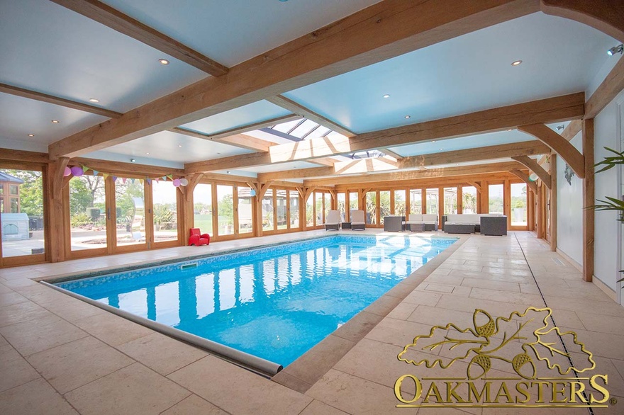 This lovely oak framed pool house was engineered and constructed by Oakmasters, to client's existing architectural design. The oak pool house structure called for an impressive 9-metre flat roof span, which we engineered using chunky oak ceiling beams. Orangery-style lanterns were added to help the light flood in through the roof.