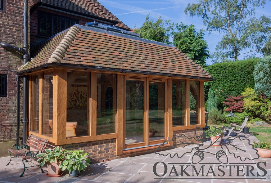 The owners of this lovely country house wanted to make the most of the afternoon sun flooding their beautiful garden. Adding an oak framed garden room on the back of their home was an obvious choice. The new structure was slightly restricted in height due to second floor windows on the existing house, so they opted for an oak framed orangery, with half glazed walls a semi flat roof and a lantern, which allows the light to pour in through the ceiling. We think brick, hung tiles and oak make a perfect match. This oak framed extension was featured in iBuild magazine.
